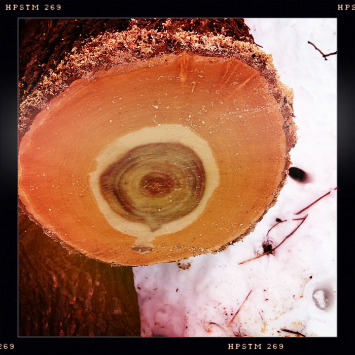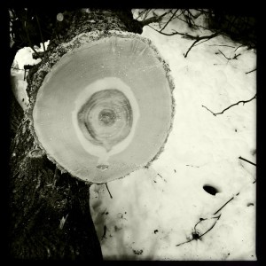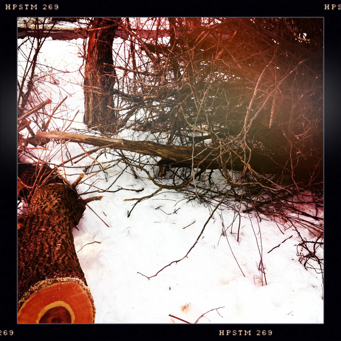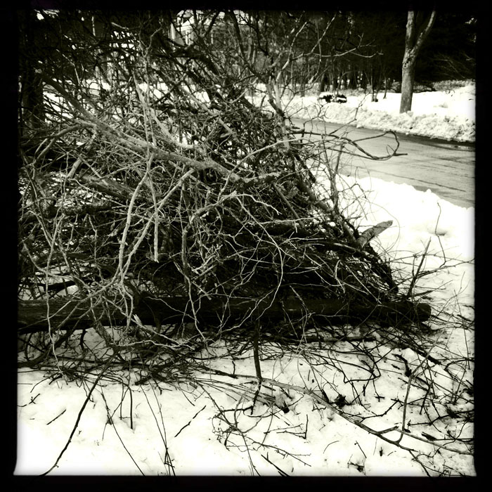 Just when you think Winter might be over, you get a crazy freak ice/wind/snow/hail/twilight zone storm in the middle of the night. On this particular night, a friend and I went to the movies and on our way back we were met with a downed tree in the road. He picked the branches out of the road, and when we got back home the parking lot was covered. We had to hand shovel an entire icy-snow path to get my car into the lot. A tree had also fallen due to the conditions and these photos are the leftovers of that tree (after our landlord cut it up!)