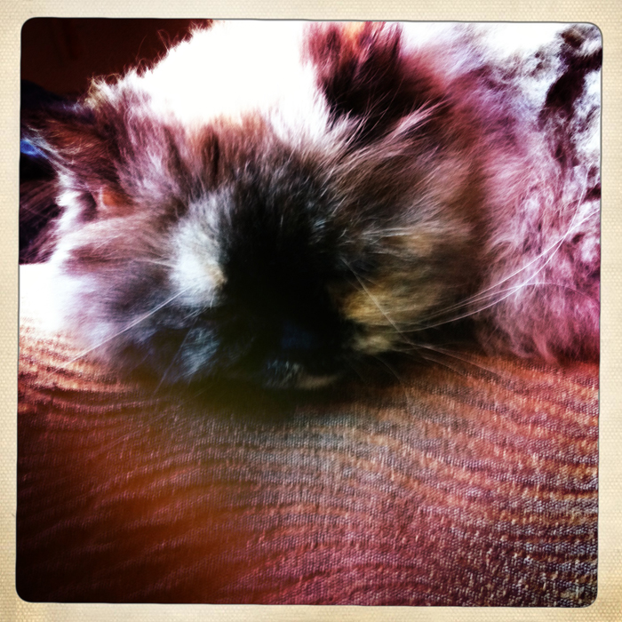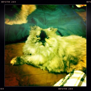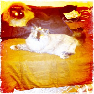 I have the best cats ever! I’ve had Trudy (the one with the smushed in face) for about 2.5 years. She’s a very docile soul that pretty much spends her day being cute. I’ve had Boris for a little over a year – he’s a massive ball of fur. He likes to sleep on my chest at the most annoying times, and I almost started a video mystery blog called “Why Cat Pee Floor?” – you can imagine why. Â I love the photo with both of them on the bed because they don’t exactly like each other, so it was a fun opportunity (even though they look like demons!)
